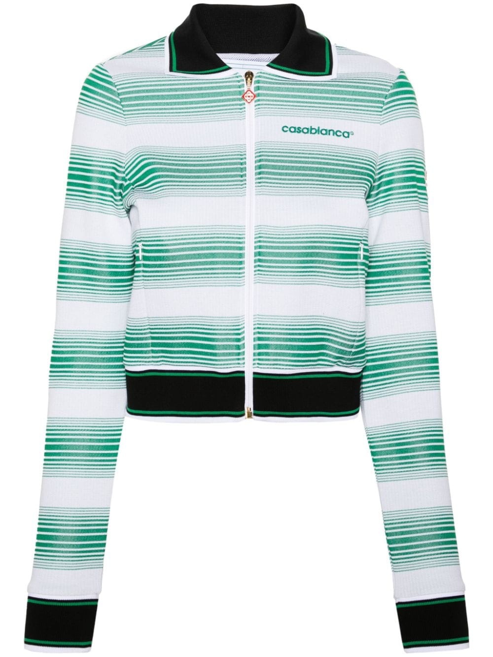 logo-embroidered striped sweatshirt Highlights - White/black/green - Cotton blend - Horizontal stripe pattern - Embroidered logo at the chest - Logo patch at the sleeve - Spread collar - Front zip fastening - Long sleeves - Ribbed cuffs and hem - Two side zip-fastening pockets - Cropped straight hem Imported Composition Outer: Cotton 77%, Polyester 23% Lining: Cotton 100% SIZE & FIT Model measurements Height 5 ft 10 in(1.77 m) Bust/Chest 32.28 in(82 cm) Hips 35.03 in(89 cm) Waist 25.19 in(64 cm) FittingInformation Designed for a slim fit that sits just away from the body offering a close yet comfortable fit Made from a midweight fabric This piece fits true to size – take your usual size