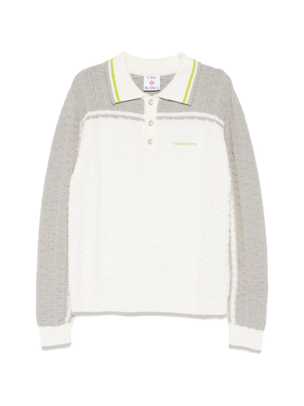 long-sleeve boucle polo shirt Highlights - White - Grey panels - Polo collar - Front button fastening - Long sleeves - Textured finish Imported Composition Cotton 72%, Nylon 27%, Spandex/Elastane 1% Washing instructions Hand Wash