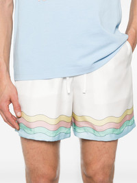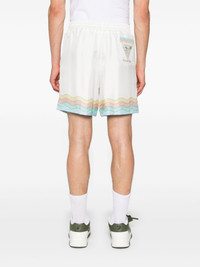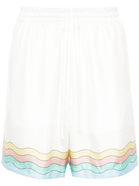 Maison De Reve silk shorts Highlights - White/multicolour - Silk - Satin weave - Stripe detailing - Graphic print to the rear - Logo print to the rear - Elasticated waistband with internal drawstring - Two side inset pockets - Rear patch pocket - Straight leg - Knee-length - Full lining Made in Italy Composition Lining: Polyester 100% Outer: Silk 100% SIZE & FIT Model measurements Height 6 ft 2 in(1.87 m) Bust/Chest 37.79 in(96 cm) Hips 37.79 in(96 cm) Waist 30.31 in(77 cm) FittingInformation Designed for a straight-leg fit, offering an unrestricted and comfortable fit over the leg The elasticated waist allows for a comfortable fit Made from a lightweight non-stretch fabric This piece fits true to size – take your usual size