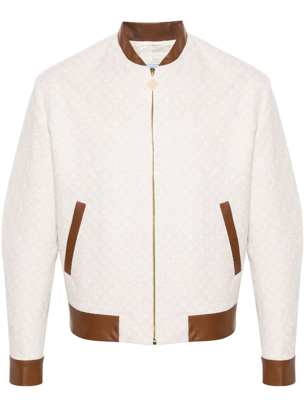 monogram-jacquard bomber jacket Highlights - White/chocolate brown - Cotton blend - Metallic threading - Monogram jacquard - Leather trim - Logo-embossed buttons - Gold-tone hardware - Baseball collar - Front zip fastening - Long sleeves - Buttoned cuffs - Two side stud-fastening pockets - Full lining - Straight hem Imported Composition Outer: Lamb Skin 100%, Cotton 66%, Polyamide 30%, Metallic Fibre 4% Lining: Viscose 52%, Cotton 48% SIZE & FIT Model measurements Height 6 ft 2 in(1.87 m) Bust/Chest 36.22 in(92 cm) Hips 37 in(94 cm) Waist 27.95 in(71 cm) FittingInformation Designed for a relaxed fit, this piece allows for comfort and movement when worn Made from a midweight fabric This piece fits true to size – take your usual size Washing instructions Dry Clean Only