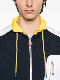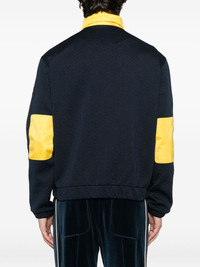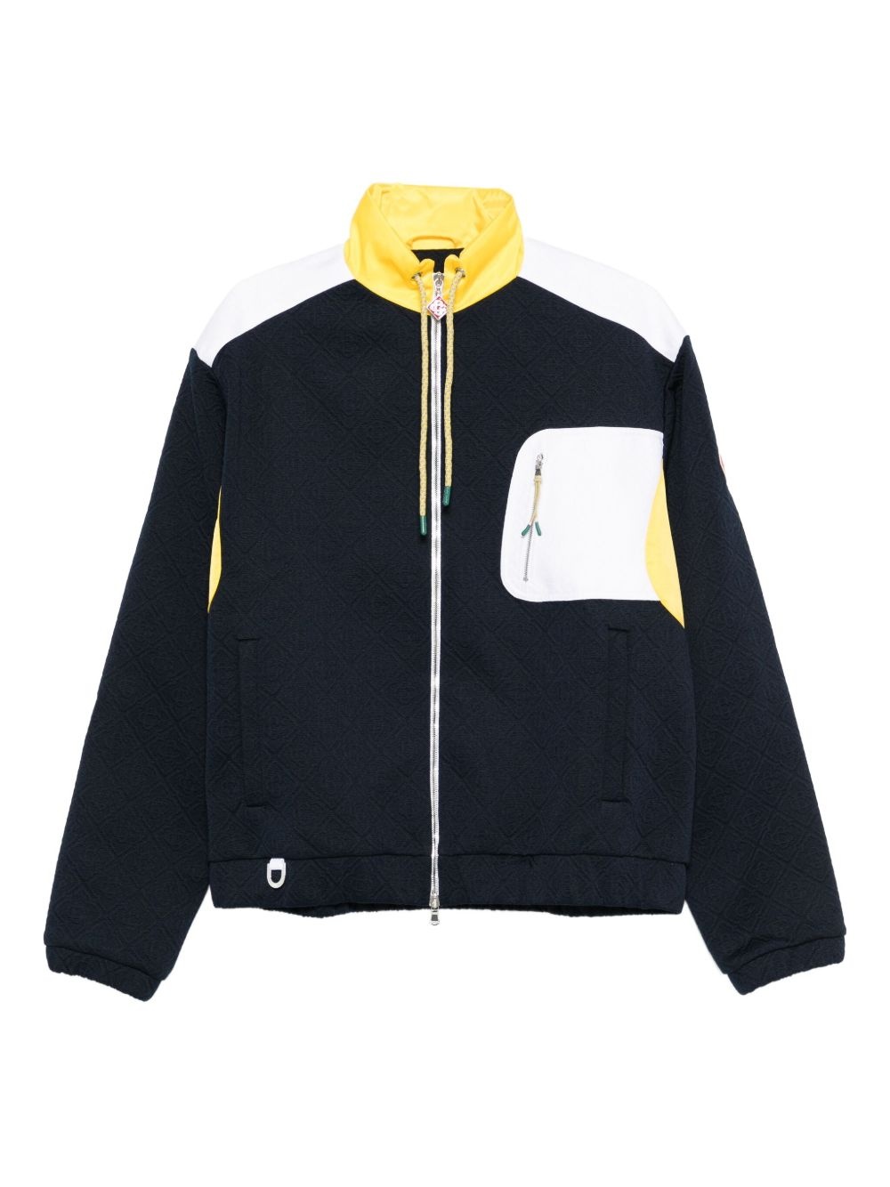 monogram-jacquard jacket Highlights - Navy blue - Quilted texture - Zip fastening - High neck - Panelled design - Contrasting yellow panels - White panel detail Imported Composition Polyester 65%, Polyamide 18%, Cotton 17% SIZE & FIT Model measurements Height 6 ft 2 in(1.88 m) Bust/Chest 37.4 in(95 cm) Hips 38.58 in(98 cm) Waist 31.1 in(79 cm) Washing instructions Dry Clean Only
