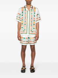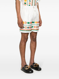 Playful Eagle silk shorts Inspired by Nigeria, Casablanca showcases a playful geometric design that embellishes these white shorts. The relaxed silhouette is made from soft silk. Highlights - White/multicolour - Silk - Satin weave - Geometric print - Elasticated drawstring waistband - Two side slit pockets - Rear patch pocket - Straight hem - Full lining - Thigh-length - When buying this unisex item, keep in mind that it is graded in standard men's sizing. Made in Italy Composition Lining: Polyester 100% Outer: Silk 100% SIZE & FIT Model measurements Height 6 ft 2 in(1.87 m) Bust/Chest 36.22 in(92 cm) Hips 37 in(94 cm) Waist 27.95 in(71 cm) FittingInformation Designed for relaxed fit, offering a comfortable loose fit over the leg Adjust this piece’s waistband to your preference using the drawstring Made from a lightweight non-stretch fabric This piece fits true to size – take your usual size