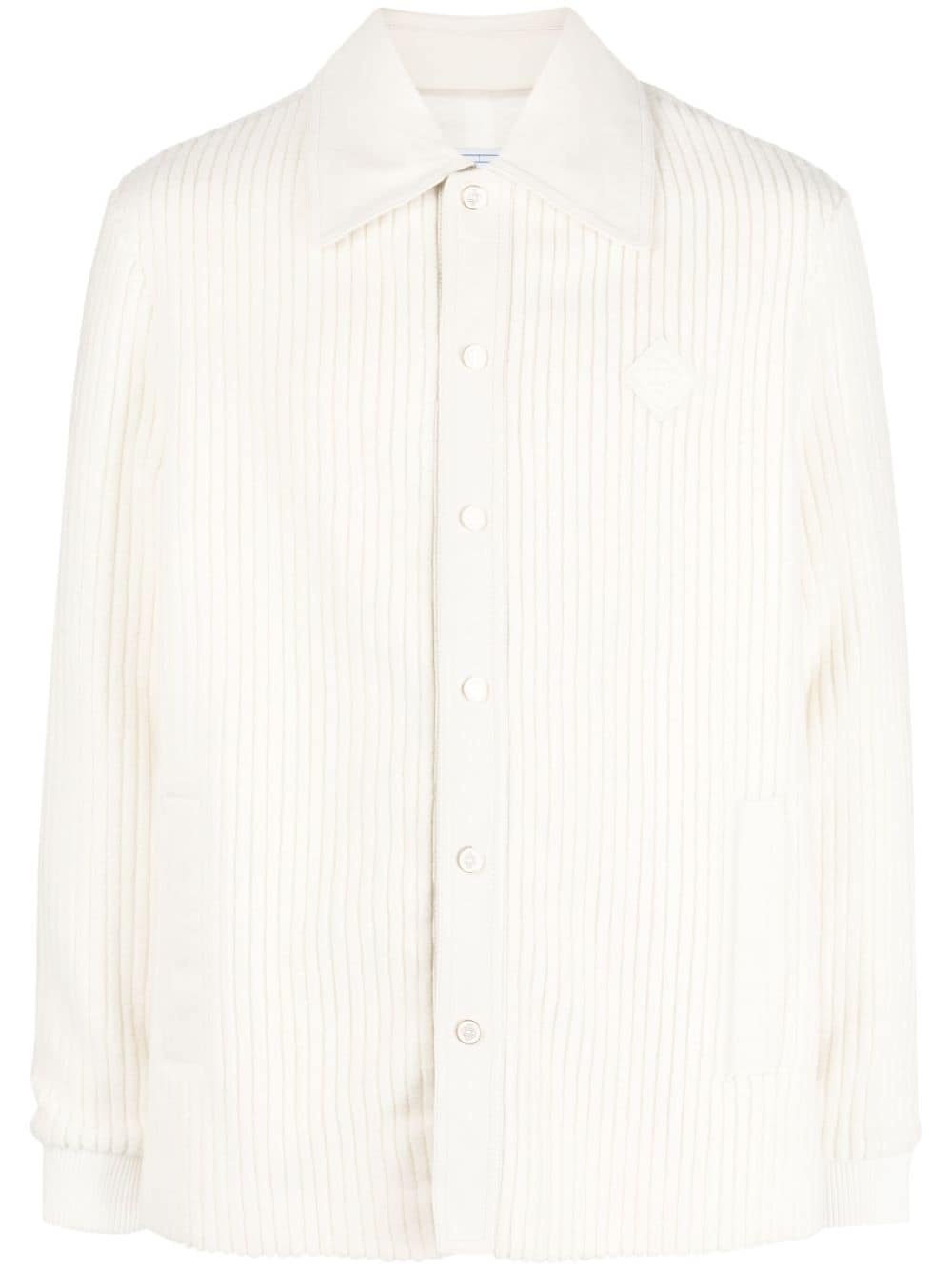 ribbed buttoned cardigan A cross between a jacket and a cardigan, this knitted piece speaks to Casablanca's creative flair and affinity for leisurewear. It's rendered in off-white virgin wool blend to a finely ribbed construction and fuzzy texture for a soft and cosy sensation. Highlights - Off-white - Virgin wool blend - Ribbed detailing - Textured finish - Classic collar - Front button fastening - Elasticated cuffs - Straight hem Imported Composition Outer: Virgin Wool 71%, Cotton 29% Lining: Viscose 52%, Cotton 48% SIZE & FIT Model measurements Height 6 ft 1 in(1.86 m) Bust/Chest 36.61 in(93 cm) Hips 37 in(94 cm) Waist 28.74 in(73 cm) FittingInformation Designed for a regular fit, allowing for a comfortably loose fit throughout the body Made from a midweight non-stretch fabric This piece fits true to size – take your usual size