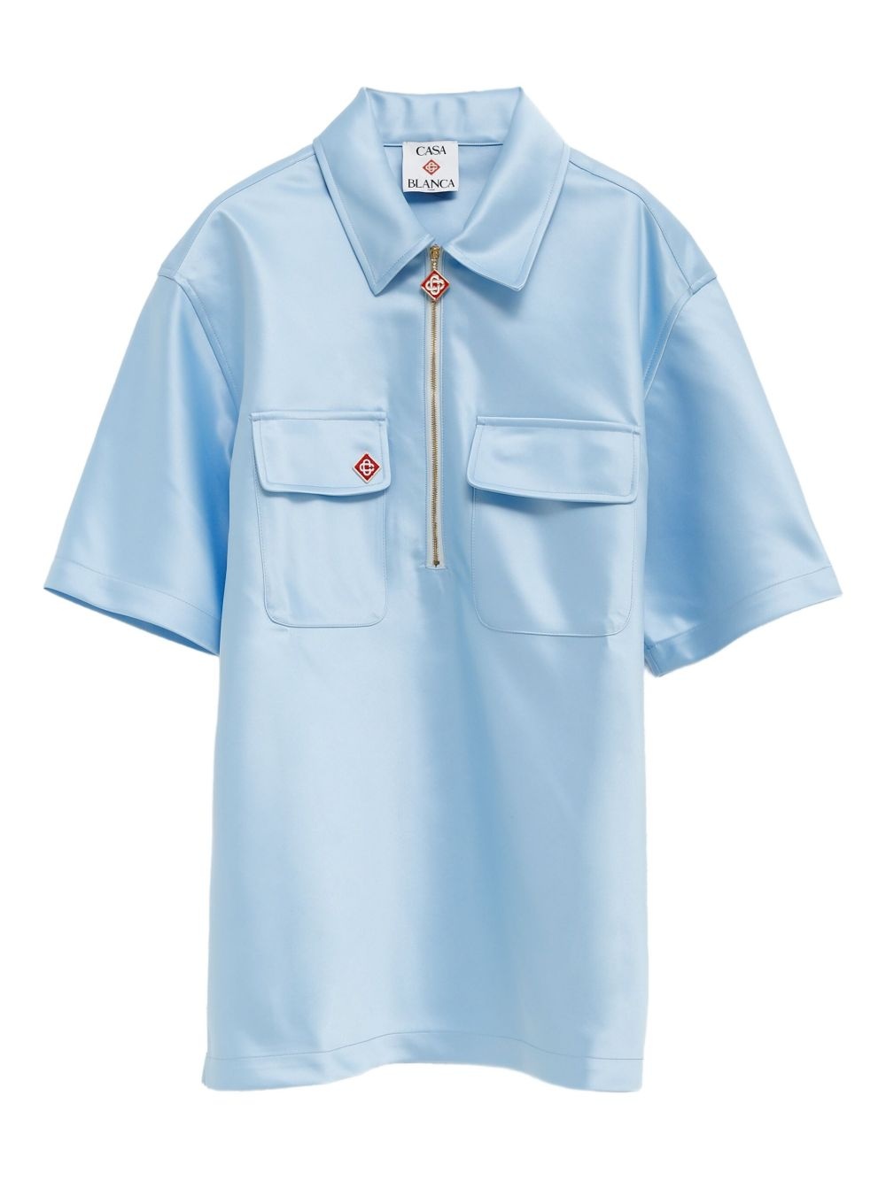 satin zip-up shirt Highlights - Light blue - Chest flap pockets - Logo plaque - Classic collar - Short sleeves Made in Italy Composition Viscose 100%, Polyester 100%