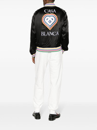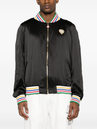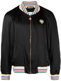 Souvenir logo-patch bomber jacket Casablanca's Souvenir bomber jacket nods to the brand's penchant for playful and brand-focused designs. A multicoloured striped trim contrasts the piece's black silk construction, accented with a logo patch on the chest and back. Highlights - Black/multicolour - Silk - Stripe trim - Logo patch at the chest - Logo patch to the rear - Embroidered logo to the rear - Baseball collar - Front zip fastening - Long sleeves - Elasticated cuffs - Elasticated hem Imported Composition Outer: Silk 100%, Polyester 45%, Viscose 30%, Polyurethane 25% Lining: Viscose 52%, Cotton 48% SIZE & FIT Model measurements Height 6 ft 2 in(1.88 m) Bust/Chest 35.03 in(89 cm) Hips 35.82 in(91 cm) Waist 27.95 in(71 cm) FittingInformation Designed for a relaxed fit, this piece allows for comfort and movement when worn The ribbed hem offers a close, comfortable fit Made from a midweight non-stretch fabric This piece fits true to size – take your usual size