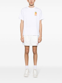 striped mid-rise track shorts Casablanca's strong graphic identity is rooted in the brand's borrowing of an 80s country club aesthetic. These track shorts boast a striped trim and the brand's signature diamond patch logo at the front. Highlights - White/light blue - Side stripe detailing - Logo patch to the side - Mid-rise - Elasticated waistband with internal drawstring - Two side slit pockets - Rear slit pocket - Straight leg - Thigh-length - Mesh lining Imported Composition Outer: Polyester 100% Lining: Polyester 100% SIZE & FIT Model measurements Height 6 ft 2 in(1.87 m) Bust/Chest 36.41 in(92.5 cm) Hips 35.43 in(90 cm) Waist 29.52 in(75 cm) FittingInformation Designed for relaxed fit, offering a comfortable loose fit over the leg The elasticated waist allows for a comfortable fit Made from a lightweight non-stretch fabric This piece fits true to size – take your usual size