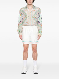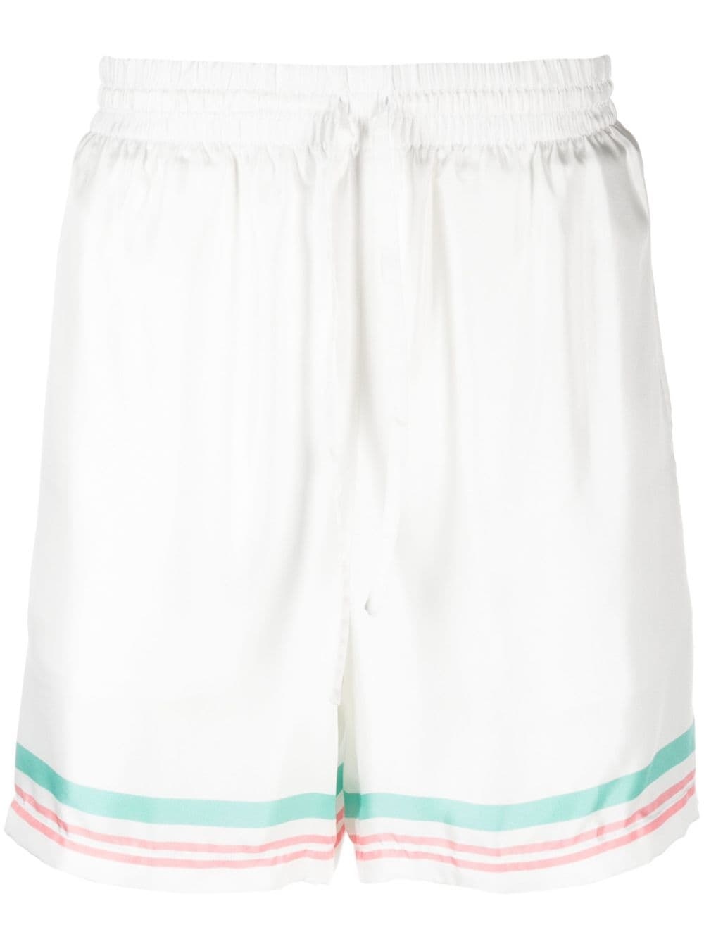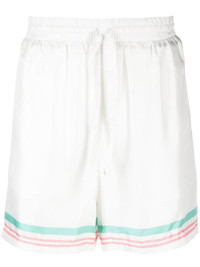 Tennis Club Icon silk shorts These Tennis Club Icon track shorts are crafted in Italy from white silk and display Casablanca's signature artwork on the back pocket, for a subtle branded finish. Highlights - White - Silk - Stripe trim - Logo print to the rear - Elasticated drawstring waistband - Rear patch pocket Made in Italy Composition Outer: Silk 100% Lining: Polyester 100% SIZE & FIT Model measurements Height 6 ft 1 in(1.86 m) Bust/Chest 34.64 in(88 cm) Hips 35.43 in(90 cm) Waist 27.55 in(70 cm) FittingInformation Designed for relaxed fit, offering a comfortable loose fit over the leg The elasticated waist allows for a comfortable fit Made from a lightweight non-stretch fabric This piece fits true to size – take your usual size