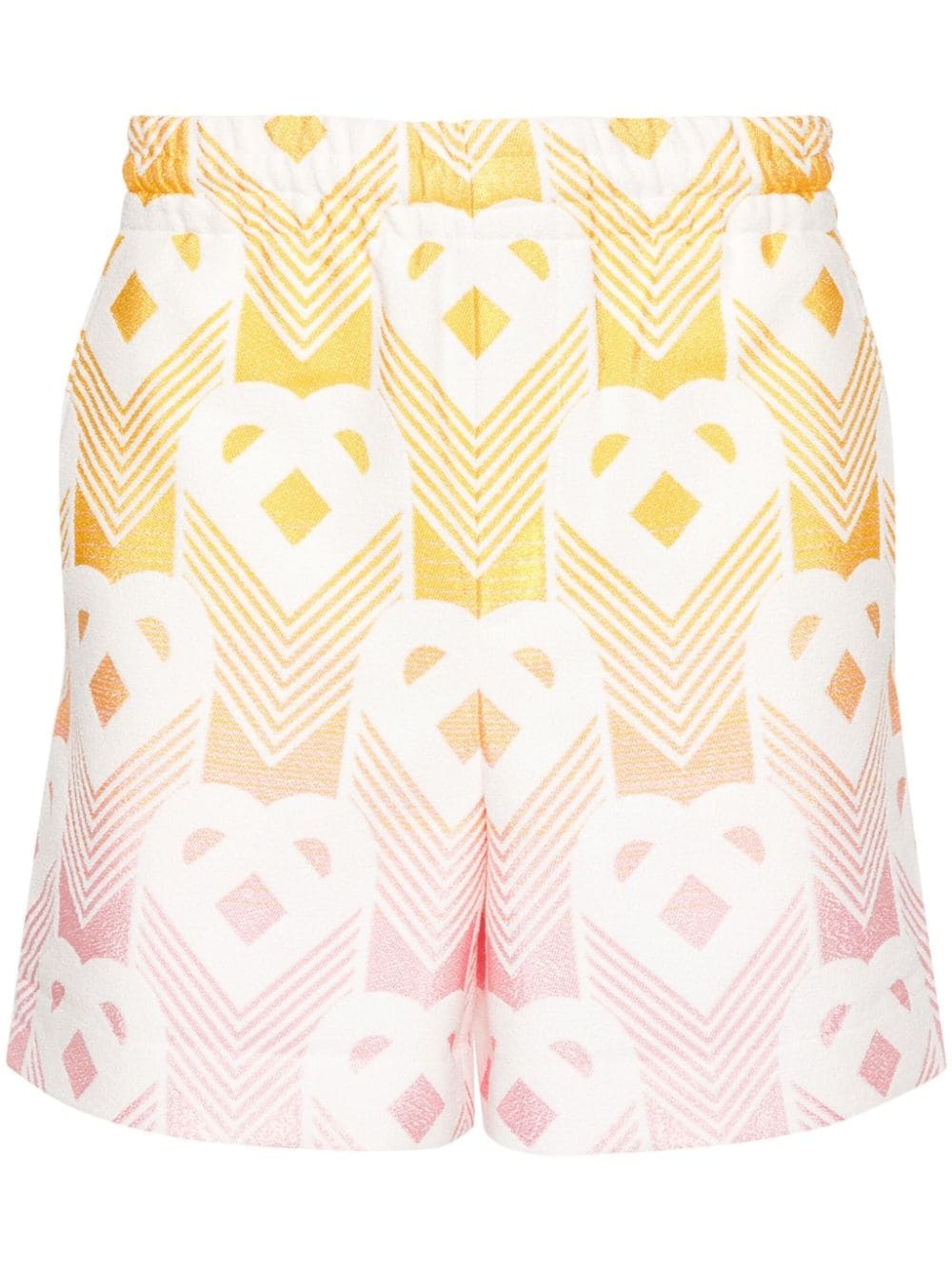 terrycloth-effect shorts Defined by a gradient effect design detailed with a monogram print, Casablanca's shorts feature an elasticated waistband. Highlights - Yellow/multicolour - Terry-cloth effect monogram - Gradient effect - Elasticated waistband with internal drawstring - Two diagonal pockets to the sides - Rear zip-fastening pocket - Knee-length - Drawstring fastening Imported Composition Outer: Cotton 31%, Viscose 22%, Polyamide 21%, Polyester 14%, Recycled Polyester 11%, Elastane 1% Lining: Cotton 100% SIZE & FIT Model measurements Height 6 ft 2 in(1.87 m) Bust/Chest 37.79 in(96 cm) Hips 37.79 in(96 cm) Waist 30.31 in(77 cm) FittingInformation Designed for a straight-leg fit, offering an unrestricted and comfortable fit over the leg Adjust this piece’s waistband to your preference using the drawstring Made from a midweight non-stretch fabric, this piece offers minimal elasticity when worn This piece fits true to size – take your usual size