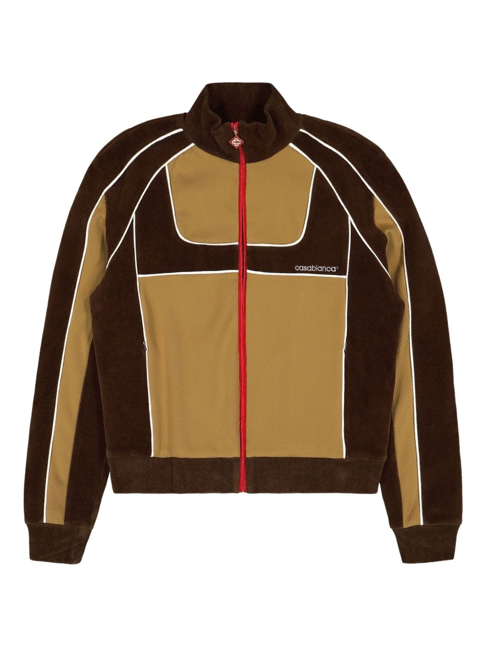 two-tone track jacket Highlights - Cedar brown - Front zip fastening - Two side zip-fastening pockets - Ribbed cuffs and hem - Logo print at the chest Imported Composition Lining: Polyester 100% Outer: Polyester 85%, Spandex/Elastane 15% Washing instructions Dry Clean Only