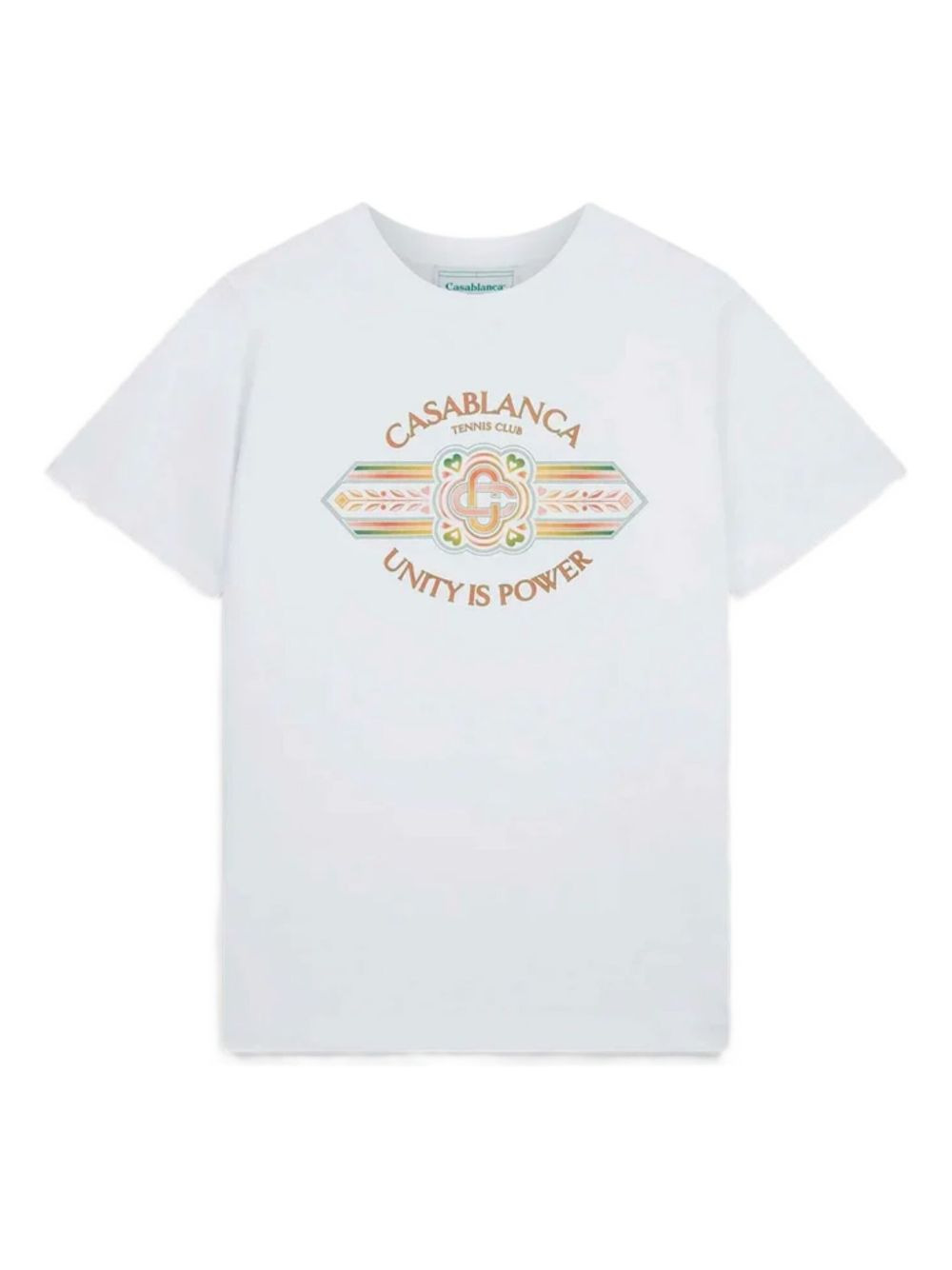 Unity Is Power "White" T-shirt Crest-inspired graphics pepper Casablanca's designs, alluding to the brand's sports-club inspiration. This short-sleeve organic-cotton T-shirt is highlighted with the Unity is Power print, a motif that conveys an important message from the brand's latest collection. Highlights - White - Organic cotton - Crew neck - Short sleeves - Graphic print to the front - Straight hem - When buying this unisex item, keep in mind that it is graded in standard men's sizing. Imported Composition Organic Cotton 100% Washing instructions Machine Wash