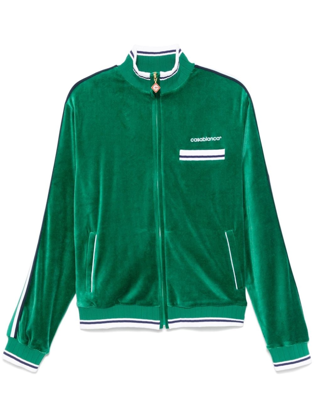 velour jacket Highlights - Forest green - Velour - Front zip fastening - Branded zip puller - High neck - Embroidered logo at the chest - Chest welt pocket - Side stripe detailing - Long sleeves - Ribbed cuffs and hem - Two side welt pockets - Mesh lining - Straight hem Imported Composition Outer: Polyester 100%, Organic Cotton 95%, Modal 40%, Polyamide 20%, Elastane 5% Lining: Cotton 100% SIZE & FIT Model measurements Height 6 ft 2 in(1.87 m) Bust/Chest 37.79 in(96 cm) Hips 37.79 in(96 cm) Waist 30.31 in(77 cm) FittingInformation Designed for a relaxed fit, this piece allows for comfort and movement when worn The ribbed hem offers a close, comfortable fit Made from a midweight non-stretch fabric, this piece offers minimal elasticity when worn