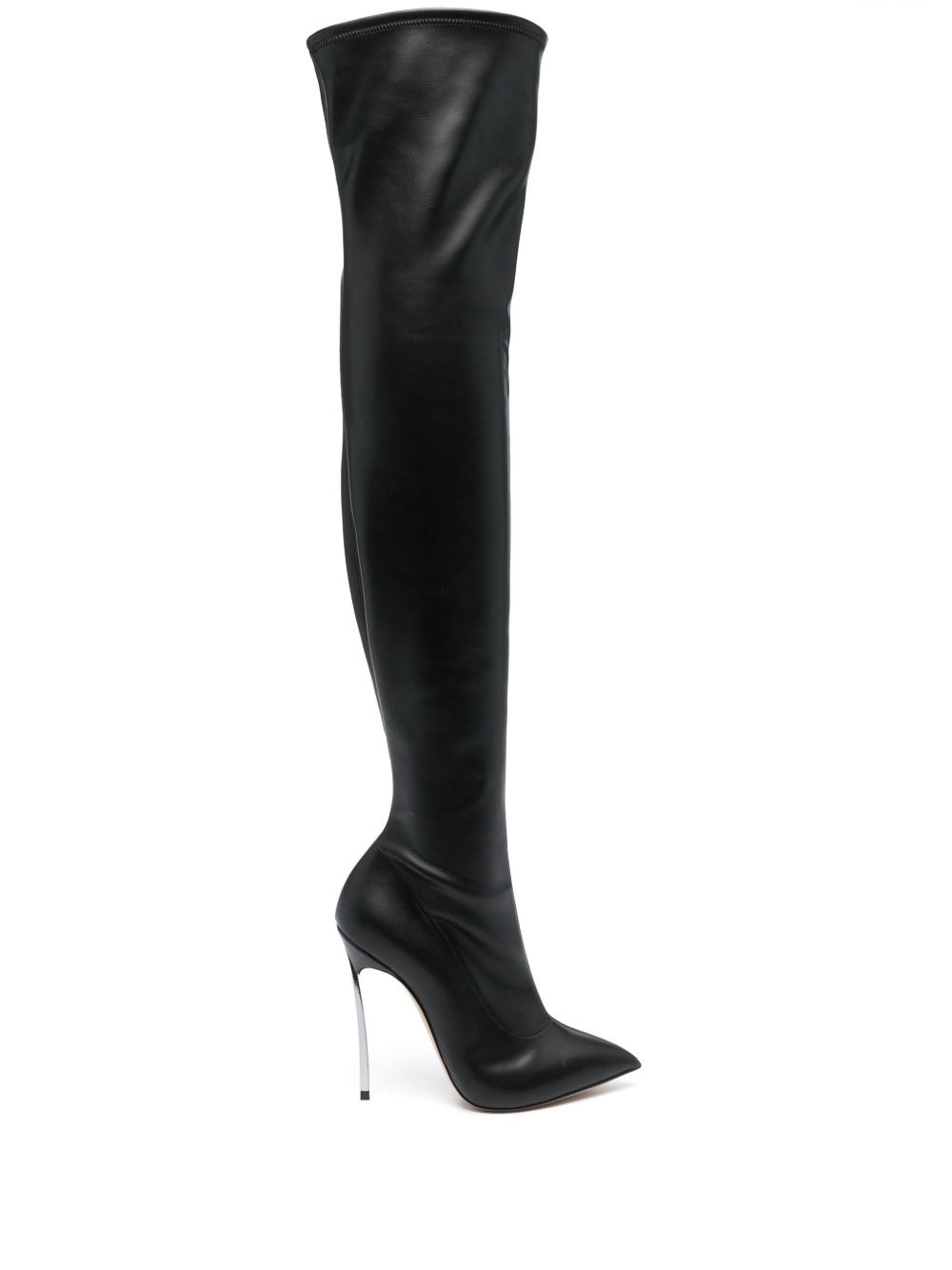 120mm Blade boots Highlights - Black - Calf leather - Smooth grain - Pointed toe - Thigh-length - Branded insole - Full lining - High stiletto heel - Leather sole - Pull-on style Made in Italy Composition Lining: Polyurethane 100%, Calf Leather 100% Outer: Polyurethane 100% Sole: Calf Leather 100%, Rubber 100% SIZE & FIT Measurement CIRCUMFERENCE 16.92 in(43 cm) HEEL 5.11 in(13 cm) HEIGHT 24.8 in(63 cm)