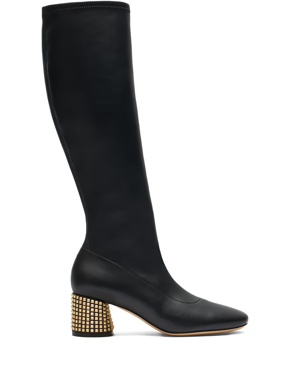 50mm leather knee-high boots Highlights - Black - Leather - Block heel - Slip-on style - Round toe - Branded insole Made in Italy Composition Outer: Polyurethane 60%, Polyester 40% Sole: Calf Leather 100% Lining: Calf Leather 100% SIZE & FIT Measurement HEEL 1.96 in(5 cm)