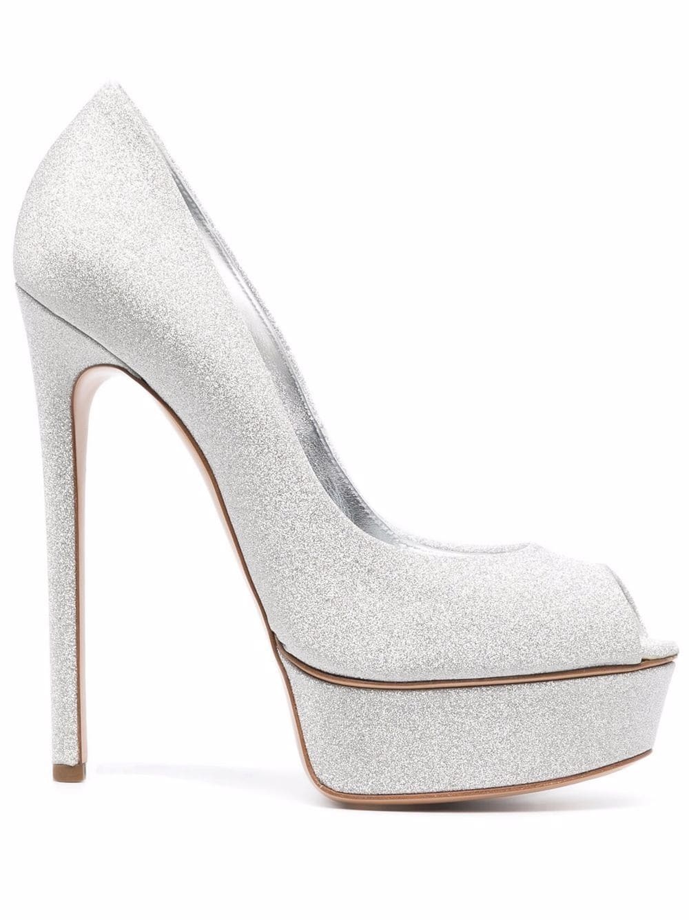 Blade siletto pumps silver leather metallic finish open toe slip-on style branded heel counter platform sole high stiletto heel Made in Italy Composition Lining: Leather 100% Sole: Leather 100% Outer: Polyester 100% SIZE & FIT Measurement HEEL 5.9 in(15 cm) PLATFORM 1.57 in(4 cm)