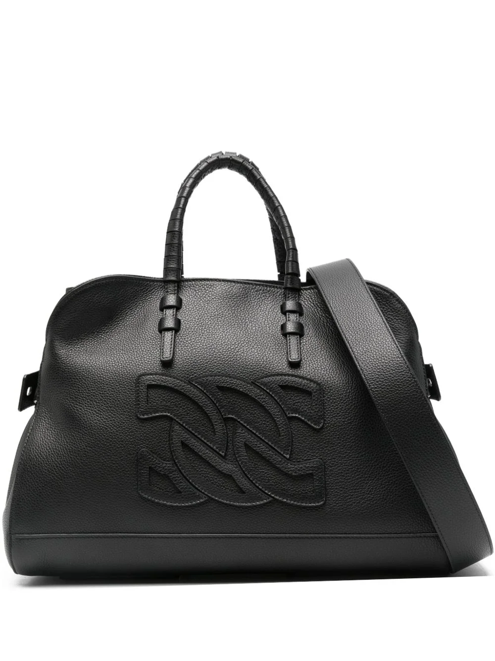 embossed-logo leather tote bag Highlights - Black - Leather construction - Embossed logo - Top handles - Buckle fastening - Detachable shoulder strap Made in Italy Composition Calf Leather 100% SIZE & FIT Measurement DEPTH 8.66 in(22 cm) HEIGHT 11.81 in(30 cm) WIDTH 17.32 in(44 cm)