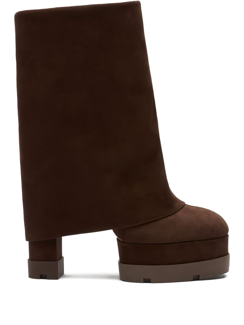 fold-over platform boots Highlights - Brown - Suede leather - Platform sole - Fold-over top - Block heel - Round toe Made in Italy Composition Outer: Calf Leather 100% Sole: Rubber 100% Fabric 100% SIZE & FIT Measurement HEEL 5.9 in(15 cm)