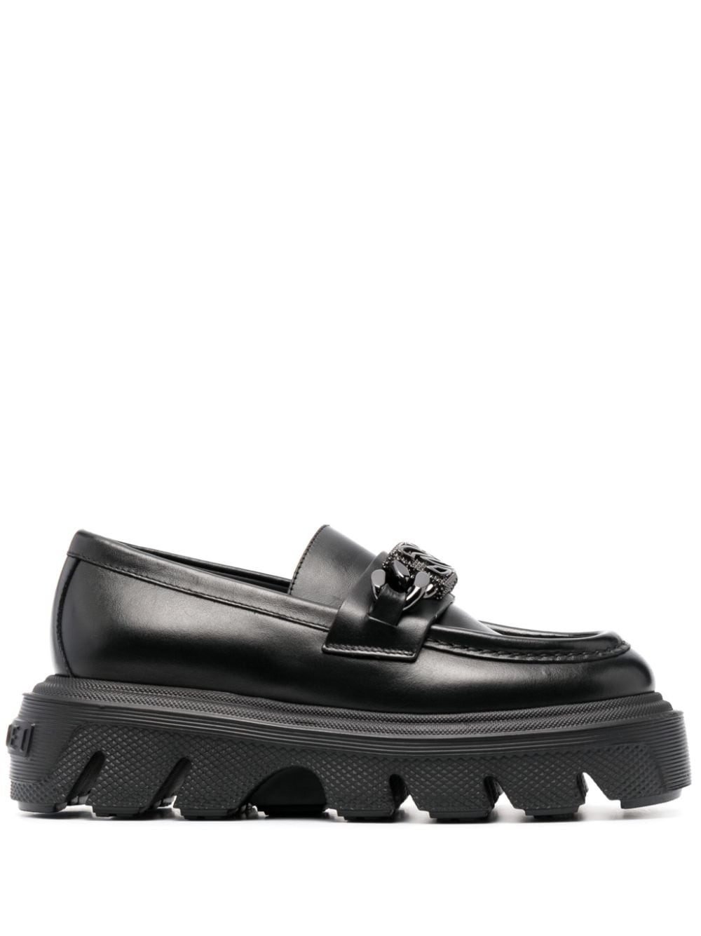logo-plaque leather loafers Highlights - Black - Calf leather - Logo plaque - Chain-link detailing - Logo at the sole - Round toe - Slip-on style - Branded insole - Flat rubber sole Made in Italy Composition Leather 100% SIZE & FIT Measurement HEEL 2.16 in(5.5 cm) PLATFORM 1.77 in(4.5 cm)