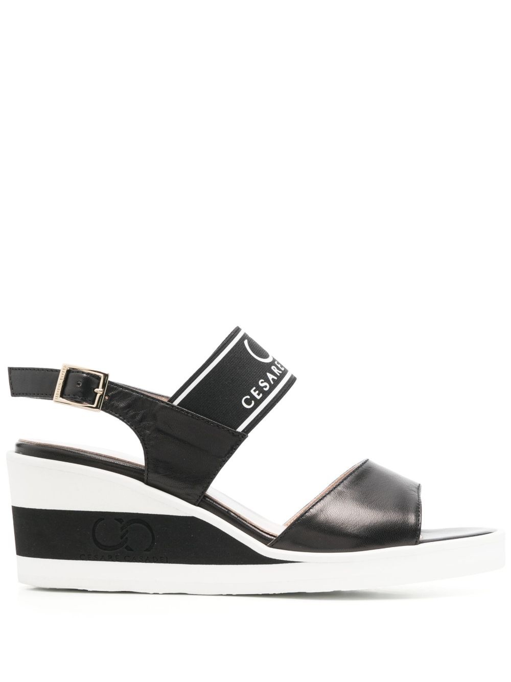 logo-print wedge sandals black/white calf leather stripe detailing logo-print strap double-strap design buckle-fastening slingback strap round toe open toe branded leather insole 70mm wedge heel Made in Italy Composition Leather 100% SIZE & FIT Measurement HEEL 2.75 in(7 cm) Sole height 0.78 in(2 cm)