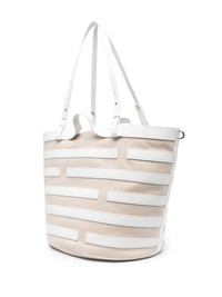 stripe-pattern leather tote bag light beige white calf leather horizontal stripe pattern embossed logo at the bottom two top handles two adjustable shoulder straps adjustable detachable shoulder strap internal logo patch internal zip-fastening pocket Made in Italy Composition Outer: Calf Leather 100%, Fabric 100% SIZE & FIT Model measurements Height 5 ft 11 in(1.8 m) Bust/Chest 31.49 in(80 cm) Hips 36.22 in(92 cm) Waist 25.59 in(65 cm) Measurement DEPTH 11.81 in(30 cm) HANDLE 2.36 in(6 cm) HEIGHT 13.77 in(35 cm) STRAP 22.04 in(56 cm) WIDTH 19.68 in(50 cm)