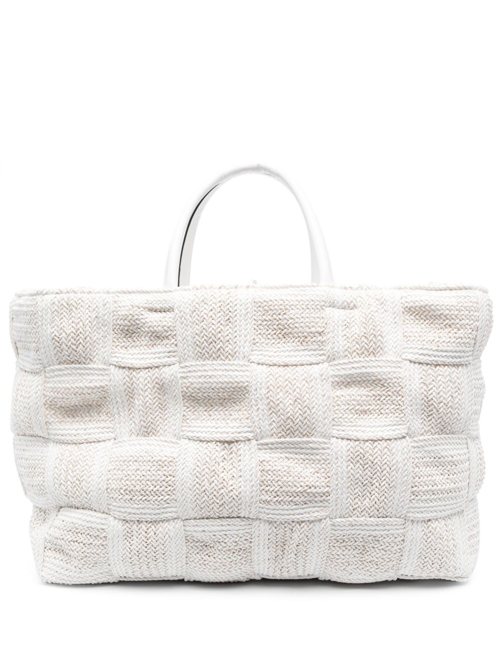 Twiga Shoppers tote bag white calf leather interwoven design two top handles internal zip-fastening pocket main compartment Made in Italy Composition Outer: Calf Leather 100%, Fabric 100% SIZE & FIT Model measurements Height 5 ft 11 in(1.8 m) Bust/Chest 31.49 in(80 cm) Hips 36.22 in(92 cm) Waist 25.59 in(65 cm) Measurement DEPTH 8.66 in(22 cm) HANDLE 6.29 in(16 cm) HEIGHT 11.81 in(30 cm) WIDTH 17.71 in(45 cm)