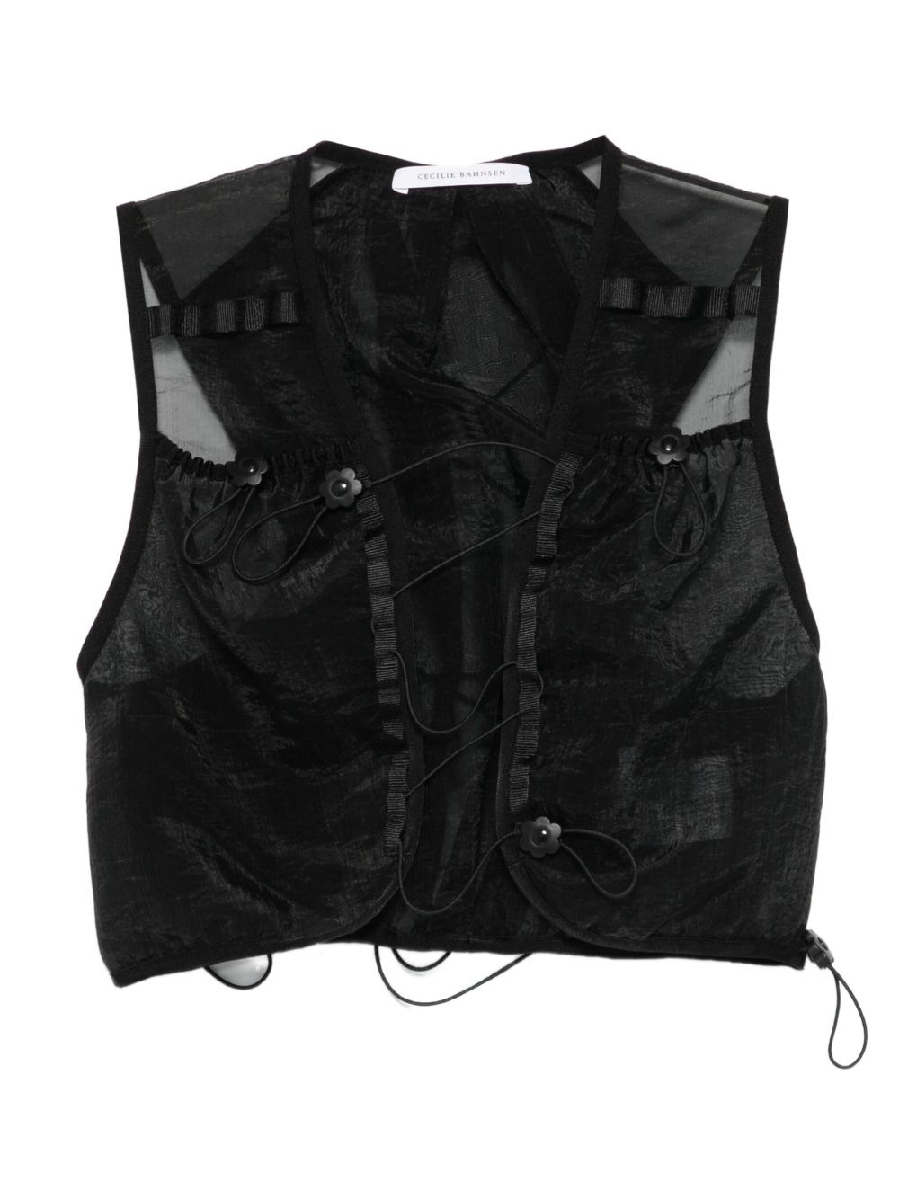 drawstring-fastening vest Highlights - Black - Floral detail - Drawstring fastening - Sleeveless - Sheer panel Imported Composition Silk 100% SIZE & FIT Model measurements Height 5 ft 10 in(1.77 m) Bust/Chest 32.28 in(82 cm) Hips 35.03 in(89 cm) Waist 25.19 in(64 cm) Washing instructions Read Manufacturer Guidelines