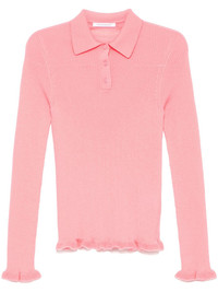 Oda top Highlights - Blush pink - Front button placket - Ruffle cuffs - Ruffle hem Made in Italy Composition Merino 100% SIZE & FIT Model measurements Height 5 ft 10 in(1.77 m) Bust/Chest 31.49 in(80 cm) Hips 35.43 in(90 cm) Waist 25.19 in(64 cm) FittingInformation Designed for a slim fit that sits just away from the body offering a close yet comfortable fit Made with a lightweight knit, this piece offers some stretch