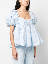 Sari floral-jacquard blouse Cecilie Bahnsen's Sari blouse is crafted from dimensional Dahlia Matelasse jacquard with embedded floral motifs, reflecting the brand’s whimsical aesthetic. The voluminous silhouette is framed with a charming bow fastening at the back. Highlights - Baby blue - Jacquard - Matelasse effect - Fully ruffled - Sweetheart neck - Rear tie fastening - Short puff sleeves - Open back - Straight hem Imported Composition Polyester 89%, Polyamide 11% SIZE & FIT Model measurements Height 5 ft 10 in(1.79 m) Bust/Chest 33.07 in(84 cm) Hips 35.82 in(91 cm) Waist 24.01 in(61 cm) FittingInformation Designed for a close fit at the chest with a loose fit over the waist and hips The tie fastening gives an adaptable and personalised fit Made from a lightweight non-stretch fabric This piece fits true to size – take your usual size Washing instructions Dry Clean Only
