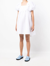 Tilde puff-sleeved dress Highlights - White - Organic cotton-blend - Short puff sleeves - Rear tie fastening - Textured finish - Square neck - Flared Imported Composition Organic Cotton 68%, Polyester 32% SIZE & FIT Model measurements Height 5 ft 10 in(1.77 m) Bust/Chest 31.49 in(80 cm) Hips 35.43 in(90 cm) Waist 25.19 in(64 cm) Measurement BUST 26.77 in(68 cm) WAIST 35.43 in(90 cm) HIPS 39.37 in(100 cm) FittingInformation This piece fits true to size. We recommend you get your regular size Designed for a close fit at the bust. If you like a looser fit, get one size up Made with a mid-weight fabric
