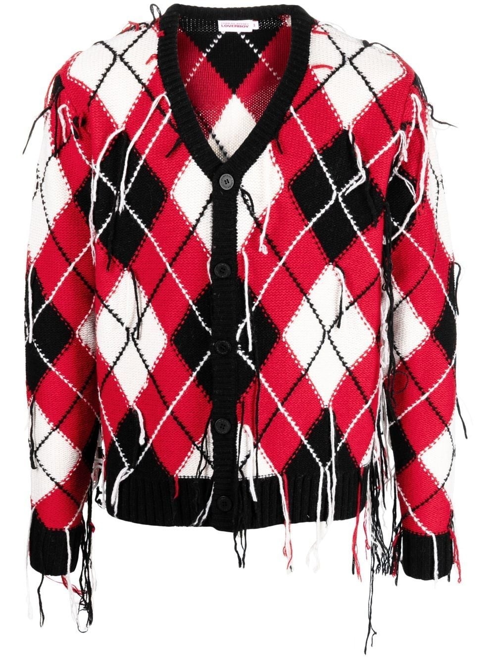 fringed argyle-knit V-neck cardigan red/black/white lambs wool-recycled nylon blend argyle intarsia knit fringe detailing ribbed V-neck front button fastening long sleeves ribbed cuffs ribbed hem When buying this unisex item, keep in mind that it is graded in standard men's sizing. Imported Composition Lambs Wool 80%, Recycled Nylon 20% SIZE & FIT Model measurements Height 5 ft 11 in(1.8 m) Bust/Chest 31.49 in(80 cm) Hips 36.22 in(92 cm) Waist 25.59 in(65 cm) Measurement SLEEVE LENGTH 26.77 in(68 cm) LENGTH 25.19 in(64 cm) Shoulder Width 19.68 in(50 cm) FittingInformation This piece is unisex. Please take care when selecting your size Designed for a loose fit for men and an oversized fit for women Made with a mid-weight fabric Washing instructions Hand Wash