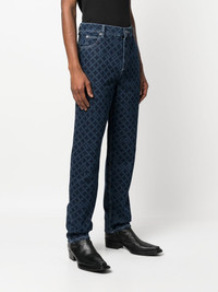 geometric-patterned straight leg jeans denim blue cotton logo patch to the rear geometric print high waist belt loops concealed front fastening classic five pockets straight leg Imported Composition Cotton 100% SIZE & FIT Model measurements Height 6 ft 1 in(1.85 m) Bust/Chest 31.88 in(81 cm) Hips 33.07 in(84 cm) Waist 26.77 in(68 cm) FittingInformation This piece fits true to size. We recommend you get your regular size Cut for a slim fit Made with a mid-weight non-stretch fabric Washing instructions Machine Wash