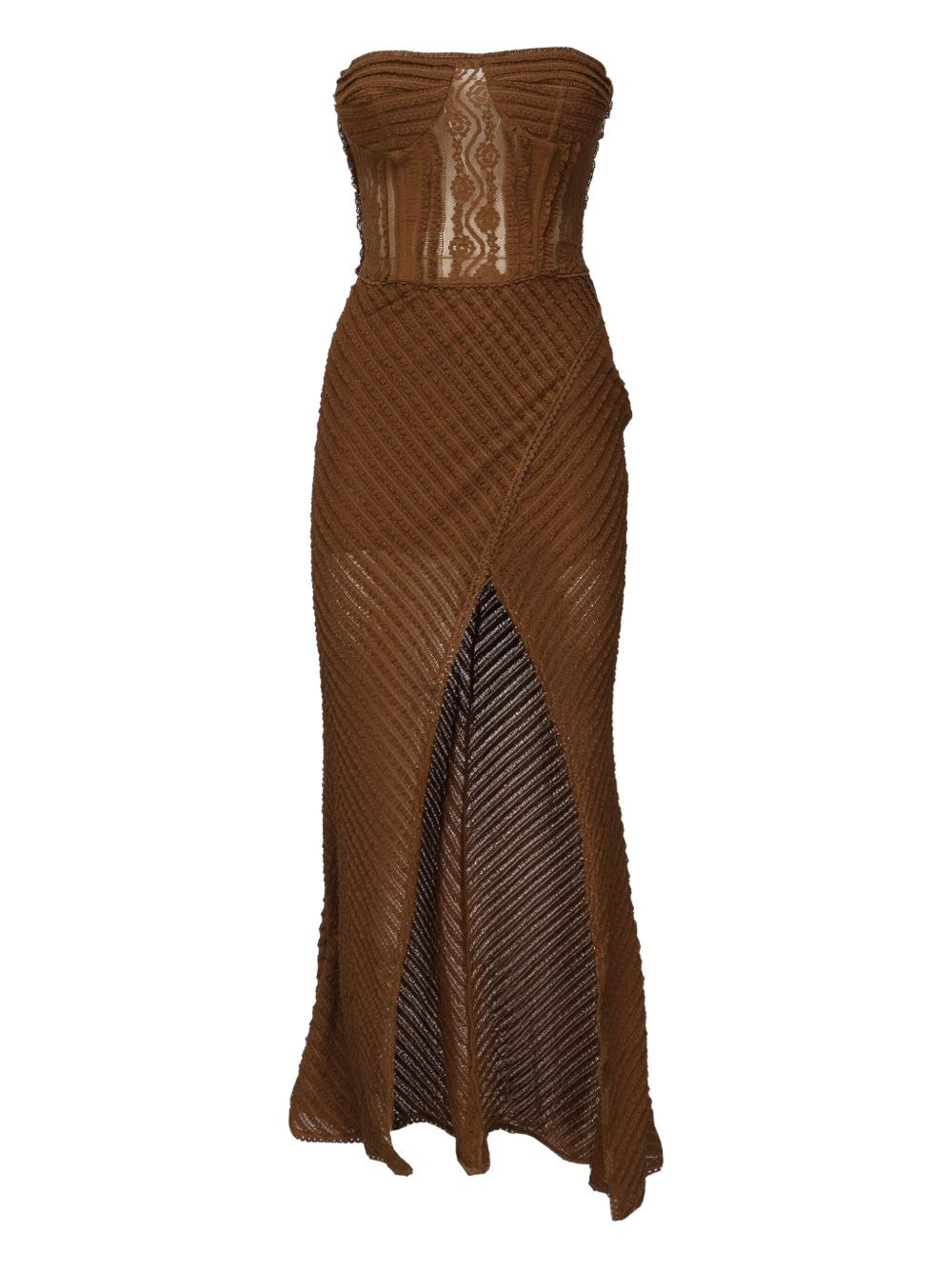 Fae mesh midi dress Highlights - Chocolate brown - Strapless neckline - Fitted bodice - Mesh fabric - Lace detail Imported Composition Cotton 50%, Nylon 30%, Polyester 17%, Elastane 3% Washing instructions Read Manufacturer Guidelines