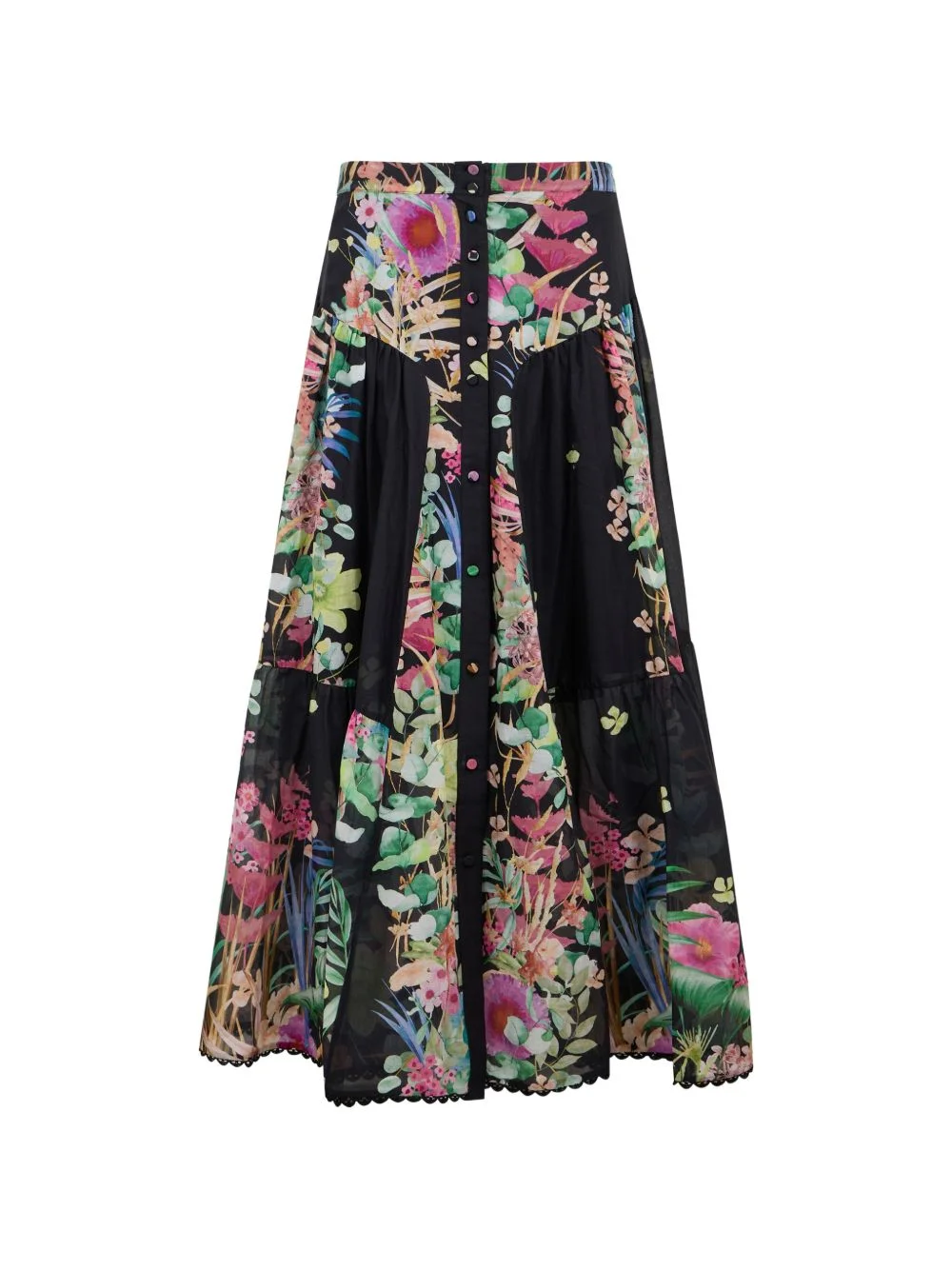 floral-print buttoned maxi skirt Highlights - Black and multicolour - Floral print - Button front fastening - Tiered - Lace trim Imported Composition Cotton 90%, Polyester 10% Washing instructions Read Manufacturer Guidelines