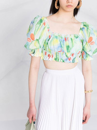graphic-print ruffled crop top multicolour cotton all-over graphic print ruffled detailing square neck short puff sleeves cropped Imported Composition Cotton 100% SIZE & FIT Model measurements Height 5 ft 10 in(1.79 m) Bust/Chest 30.31 in(77 cm) Hips 33.85 in(86 cm) Waist 25.59 in(65 cm) FittingInformation This piece fits true to size. We recommend you get your regular size Cut for a slim fit Made with a mid-weight non-stretch fabric Washing instructions Hand Wash