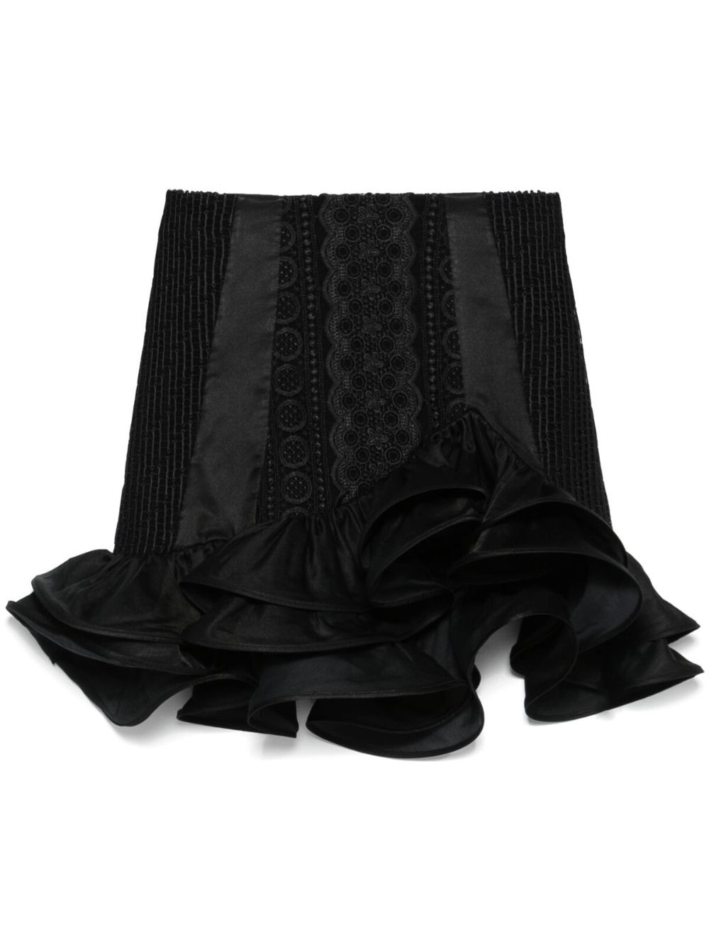 Melle mini skirt Highlights - Black - Concealed rear hook and zip fastening - Ruffled trim Imported Composition Cotton 40%, Polyester 30%, Silk 20%, Nylon 7%, Spandex/Elastane 3% SIZE & FIT Model measurements Height 5 ft 10 in(1.78 m) Bust/Chest 33.85 in(86 cm) Hips 36.61 in(93 cm) Waist 26.77 in(68 cm) FittingInformation Designed with an asymmetric hem, this skirt is intended to be worn high on the waist Made from a midweight fabric Measurement HIPS 32 in(81.3 cm) LENGTH 15.98 in(40.6 cm) WAIST 27.99 in(71.1 cm) Washing instructions Hand Wash