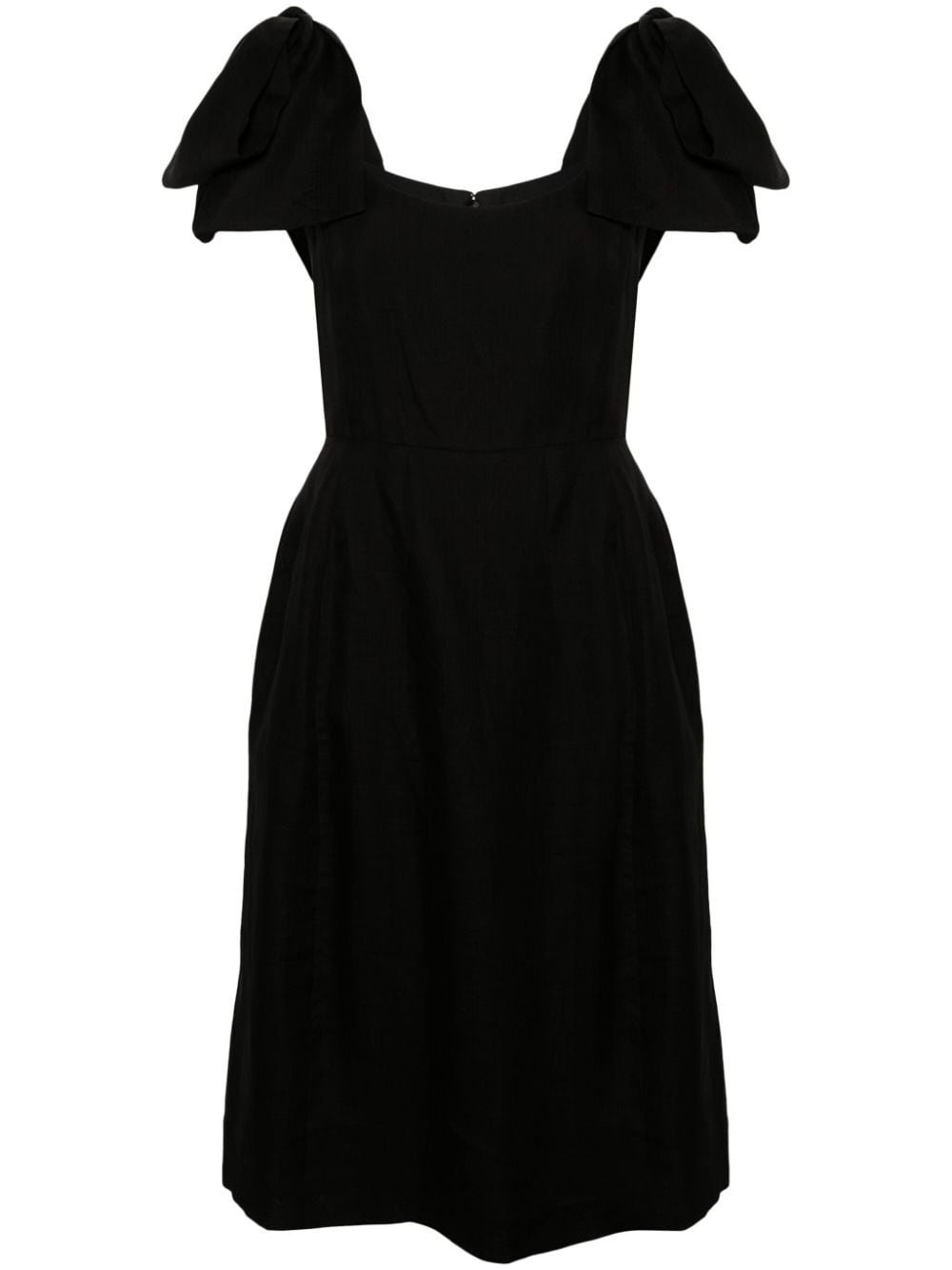 bow-detailed ramie midi dress Highlights - Black - Ramie - Oversize bow detail - Square neck - Concealed rear hook and zip fastening - Tie-fastening straps - Straight hem - Silk lining - Mid-length Imported Composition Lining: Silk 100% Outer: Ramie 100% SIZE & FIT Model measurements Height 5 ft 11 in(1.8 m) Bust/Chest 33.07 in(84 cm) Hips 37.4 in(95 cm) Waist 25.19 in(64 cm) FittingInformation Designed for a close fit at the chest and waist with a loose fit at the hip Made from a midweight non-stretch fabric This piece fits true to size – take your usual size