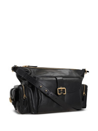 Camera shoulder bag Highlights - Black - High-shine finish - Top zip fastening - Single top handle - Gold-tone hardware - Flap-buckle fastening - Two side zip-fastening pockets - Adjustable detachable shoulder strap Made in Italy Composition Lining: Buffalo Leather 100%, Cotton 54%, Linen/Flax 46% Outer: Buffalo Leather 100% SIZE & FIT Measurement DEPTH 5.9 in(15 cm) HANDLE 9.44 in(24 cm) HEIGHT 6.49 in(16.5 cm) STRAP 23.62 in(60 cm) WIDTH 13.38 in(34 cm)