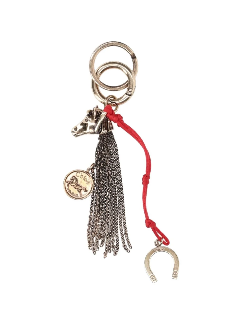 chain horse bag charm Highlights - Gold-tone - Horse detail - Chain detail - Horseshoe charm - Round charm - Red cord detail Imported Composition Lining: Brass 100% Polyester 100% SIZE & FIT Measurement WIDTH 1.57 in(4 cm) LENGTH 8.26 in(21 cm) DEPTH 1.18 in(3 cm)