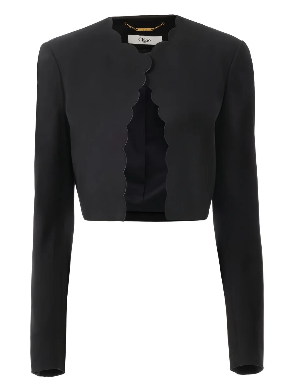 cropped cardigan Highlights - Black - Scalloped trim - Open back - Long sleeves Imported Composition Fabric 100% Washing instructions Read Manufacturer Guidelines