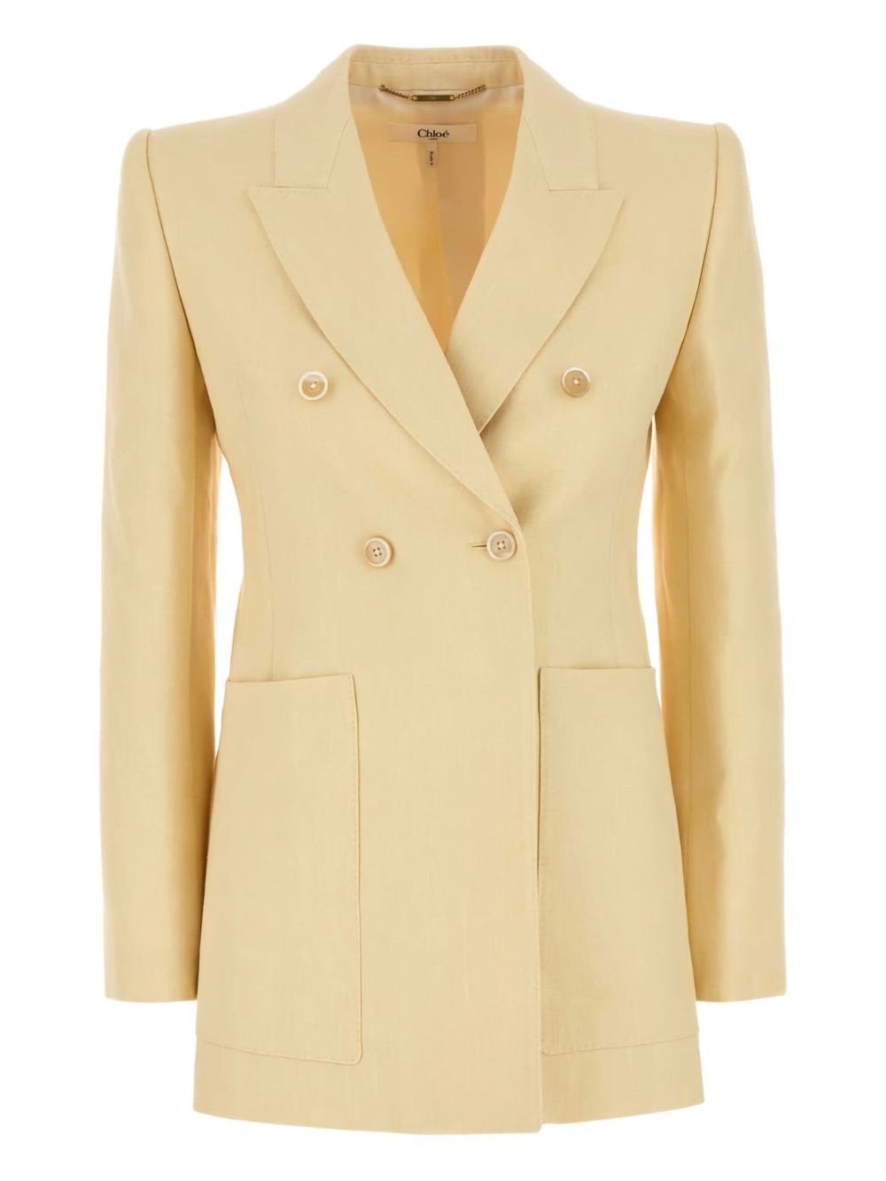 double-breasted blazer Highlights - Light yellow - Double-breasted button fastening - Two front patch pockets - Buttoned cuffs - Peak lapels Made in Italy Composition Outer: Hemp 51%, Virgin Wool 49% Lining: Silk 100%