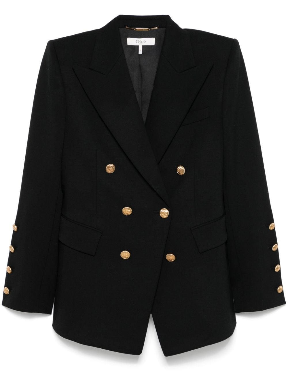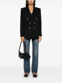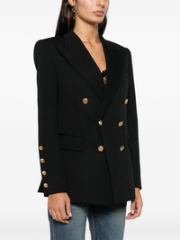double-breasted blazer Highlights - Black - Wool blend - Double-breasted button fastening - Peak lapels - Shoulder pads - Long sleeves - Buttoned cuffs - Chest welt pocket - Two front flap pockets - English rear vents - Full lining - Straight hem Made in Italy Composition Outer: Wool 98%, Elastane 2% Lining: Silk 100%, Buffalo Horn 100% SIZE & FIT Model measurements Height 5 ft 10 in(1.77 m) Bust/Chest 30.7 in(78 cm) Hips 35.03 in(89 cm) Waist 23.62 in(60 cm) FittingInformation Designed for a relaxed fit, this piece allows for comfort and movement when worn The internal shoulder pads offer a structured shape Made from a midweight non-stretch fabric Washing instructions Dry Clean Only