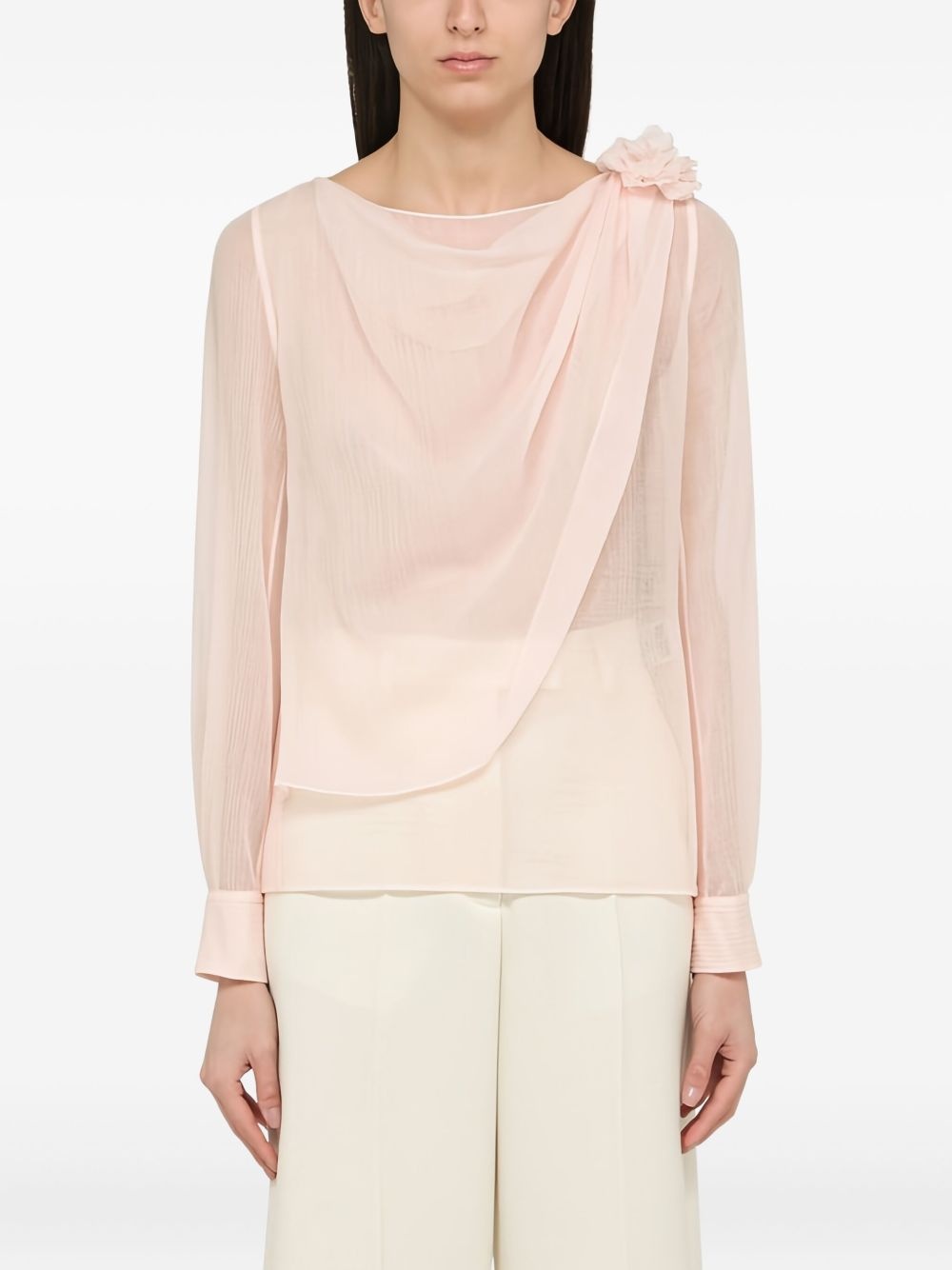 draped flower-embellished top Highlights - Pink - Draped neckline - Long sleeves - Flower embellishment - Boat neck - Sheer fabric Made in France Composition Fabric 100% Washing instructions Read Manufacturer Guidelines