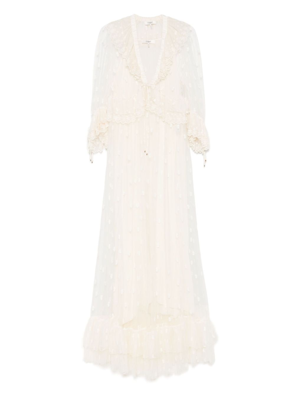 GATHERED V-NECK LONG DRESS IN EMBROIDERED LACE