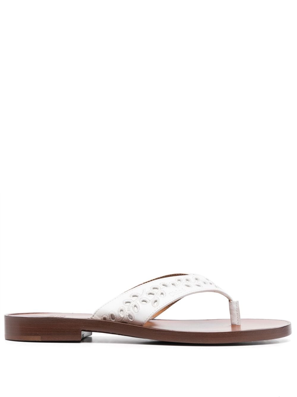 floral-embroidery flat flip flops Highlights - White/chocolate brown - Calf leather - Floral embroidery - Thong strap - Branded leather insole Imported Composition Lining: Calf Leather 100% Sole: Calf Leather 100% Outer: Calf Leather 100% SIZE & FIT Measurement HEEL 0.78 in(2 cm) Sole height 0.39 in(1 cm)