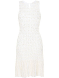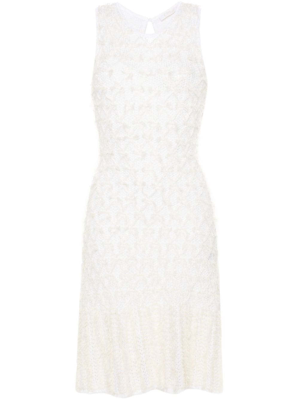 frayed mini dress Highlights - Milk white - Tweed lace knit - Open knit - Frayed detailing - Semi-sheer construction - Round neck - Sleeveless - Above-knee length - Flared skirt - Straight hem - Keyhole detail to the rear - Single rear button fastening - Detachable slip dress Made in Italy Composition Outer: Viscose 74%, Silk 17%, Cashmere 9% Lining: Viscose 100% SIZE & FIT Model measurements Height 5 ft 10 in(1.77 m) Bust/Chest 31.88 in(81 cm) Hips 36.22 in(92 cm) Waist 24.01 in(61 cm) FittingInformation Designed for a slim fit that sits just away from the body offering a close yet comfortable fit The detachable slip sits just away from the body, offering a close yet comfortable fit Made with a midweight knit, this piece offers some stretch This piece fits true to size – take your usual size