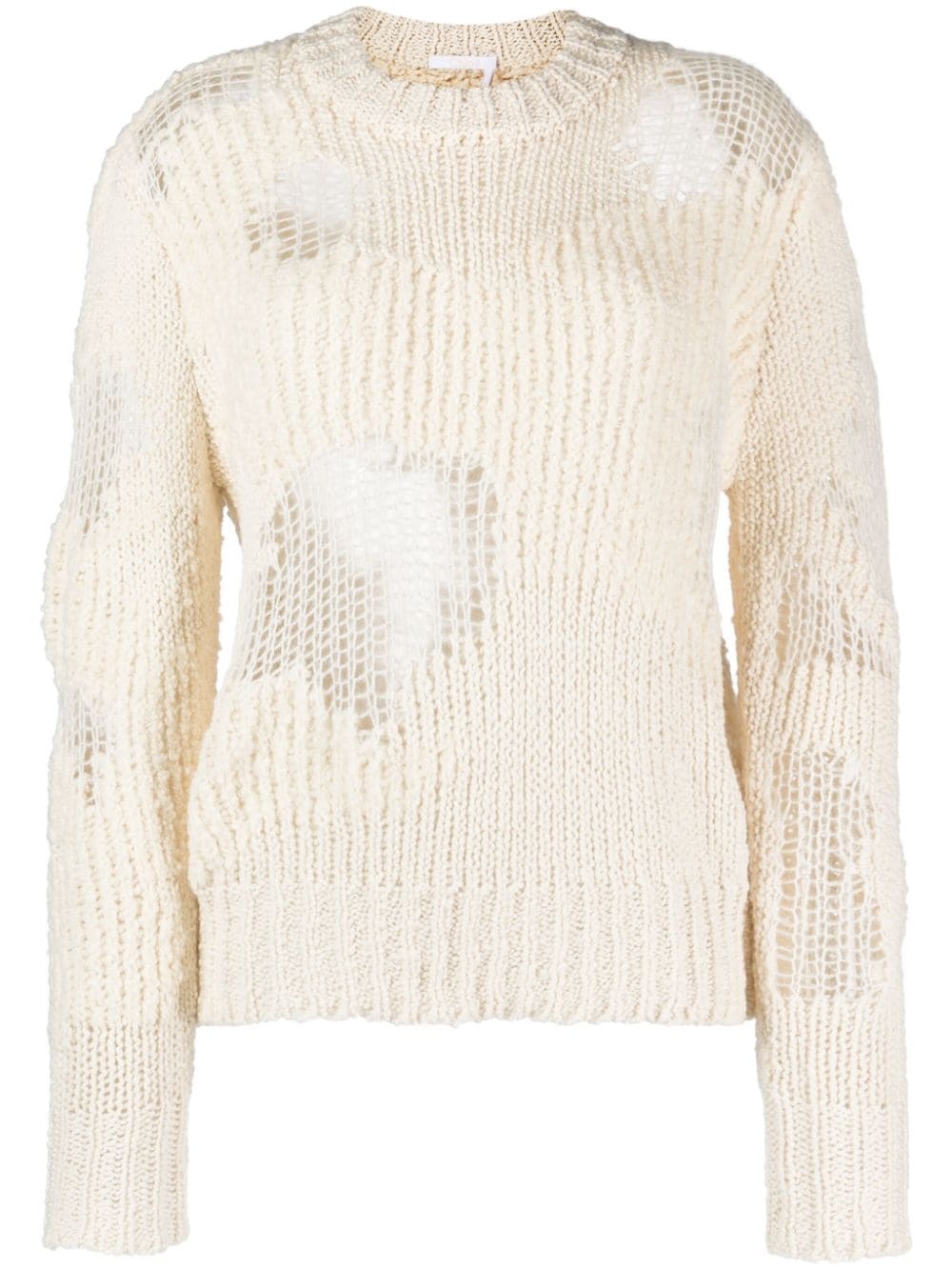 Generous chunky-knit distressed jumper Highlights - Milk white - Wool-cashmere blend - Chunky ribbed knit - Mesh detailing - Distressed effect - Semi-sheer panels - Crew neck - Long sleeves - Ribbed cuffs and hem Made in United Kingdom Composition Wool 56%, Cashmere 34%, Silk 7%, Alpaca Wool 3% SIZE & FIT Model measurements Height 5 ft 10 in(1.79 m) Bust/Chest 33.07 in(84 cm) Hips 35.82 in(91 cm) Waist 24.01 in(61 cm) Measurement SLEEVE LENGTH 17.32 in(44 cm) LENGTH 21.25 in(54 cm) WAIST 35.43 in(90 cm) BUST 44.88 in(114 cm)