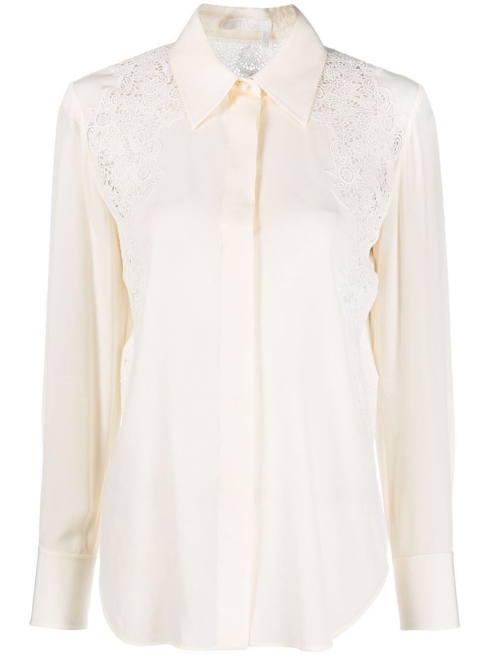 guipure-detail silk shirt Adorned with delicate guipure lace, this ivory-hued shirt showcases Chloe's romantic aesthetic for AW22. Crafted from organically produced silk, the garment is finished with mother-of-pearl buttons. Imported Composition Silk 100%, Mother of Pearl 100%, Polyester 100%, Cotton 100% SIZE & FIT Model measurements Height 5 ft 10 in(1.77 m) Bust/Chest 32.67 in(83 cm) Hips 35.43 in(90 cm) Waist 23.62 in(60 cm) FittingInformation This piece fits true to size. We recommend you get your regular size Cut for a loose fit Made with a lightweight non-stretch fabric Washing instructions Dry Clean Only