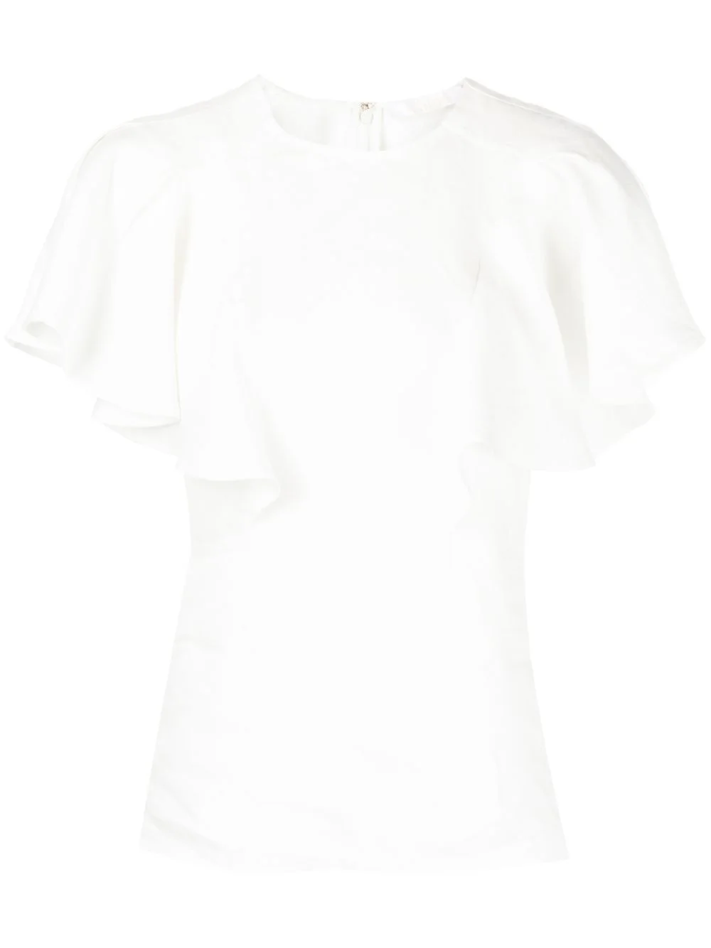 linen flutter sleeve top linen flutter sleeve top from CHLOE featuring white, organic linen, round neck, flutter sleeves, fitted waistline and concealed rear zip fastening. Conscious: This product contains at least 70% certified organic content.. Imported Composition Organic Linen 100% SIZE & FIT Model measurements Height 5 ft 10 in(1.77 m) Bust/Chest 31.88 in(81 cm) Hips 34.64 in(88 cm) Waist 24.01 in(61 cm) FittingInformation This piece fits true to size. We recommend you get your regular size Cut for a slim fit Made with a lightweight non-stretch fabric