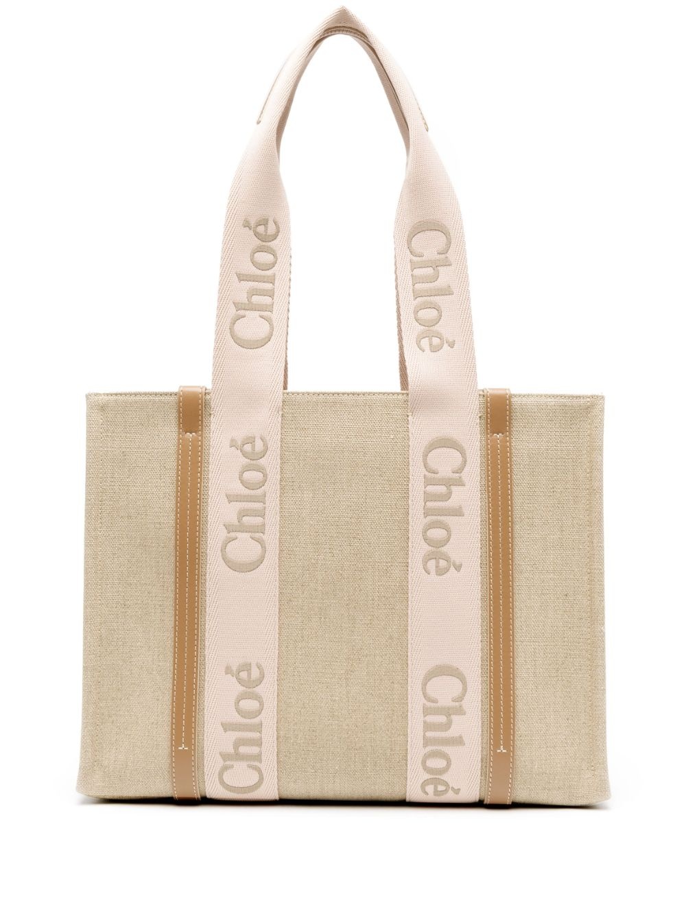 medium Woody tote bag Decorated with signature Woody ribbon trimming, this beige CHLOE tote is crafted in Italy from interwoven linen and finished with smooth calf leather. Highlights - Beige - Linen - Calf leather - Signature woody ribbon - Circular top handles - Open top - Main compartment - Internal patch pocket - Internal logo patch Made in Italy Composition Outer: Calf Leather 100%, Linen/Flax 100%, Polyester 100% Lining: Linen/Flax 100% SIZE & FIT Model measurements Height 5 ft 11 in(1.8 m) Bust/Chest 34.25 in(87 cm) Hips 35.82 in(91 cm) Waist 24.8 in(63 cm) Measurement DEPTH 4.33 in(11 cm) HANDLE 10.62 in(27 cm) HEIGHT 11.02 in(28 cm) WIDTH 14.17 in(36 cm)