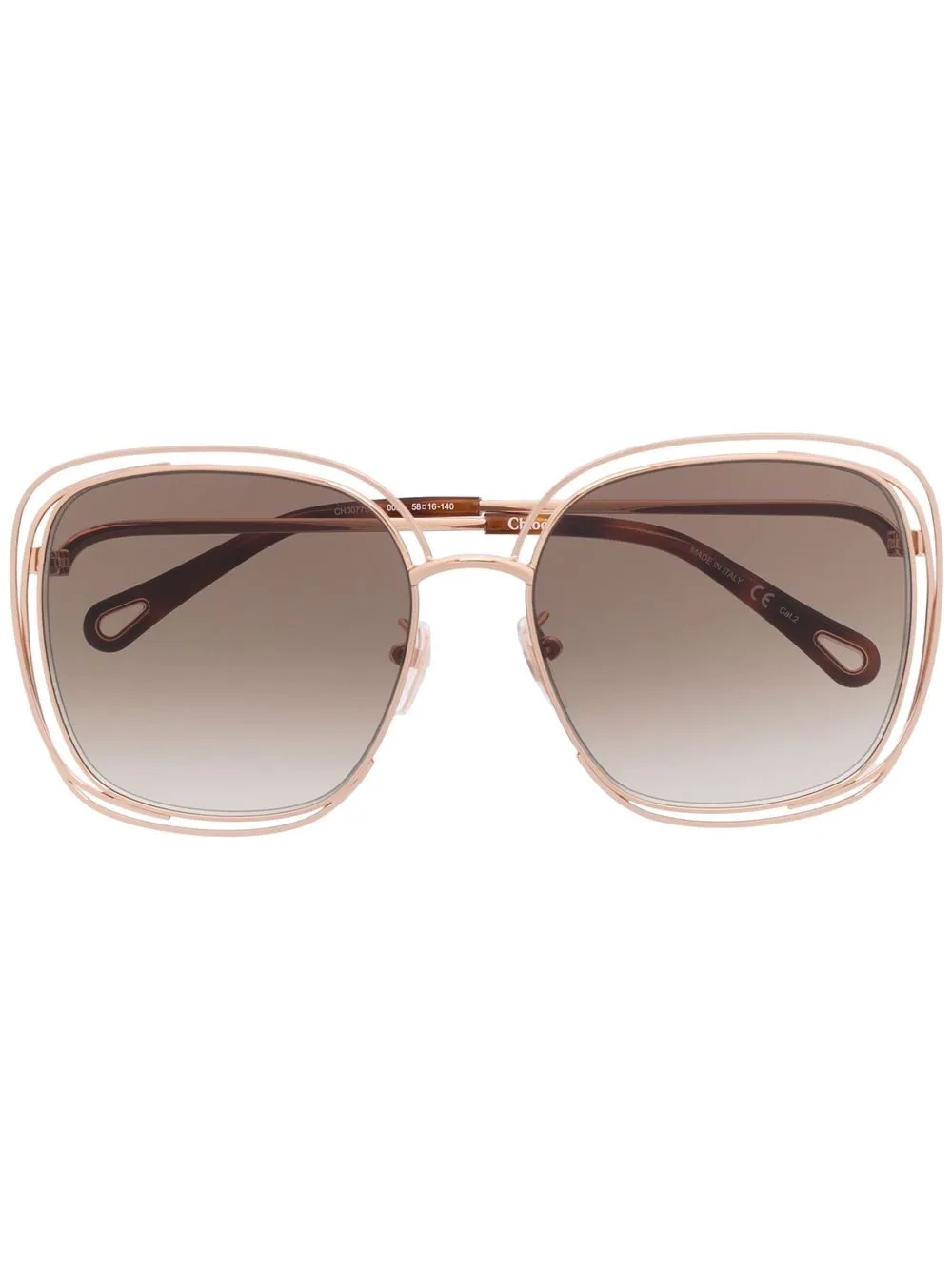 oversize frame sunglasses rose-gold metal brown tinted lenses oversize frame straight arms curved tips These glasses come with a protective case. Made in Italy Composition Metal (Other) 100% SIZE & FIT Measurement Arm Length 5.51 in(14 cm) Bridge Width 0.62 in(1.6 cm) Lens Diameter 2.28 in(5.8 cm) Total Width 5.51 in(14 cm)