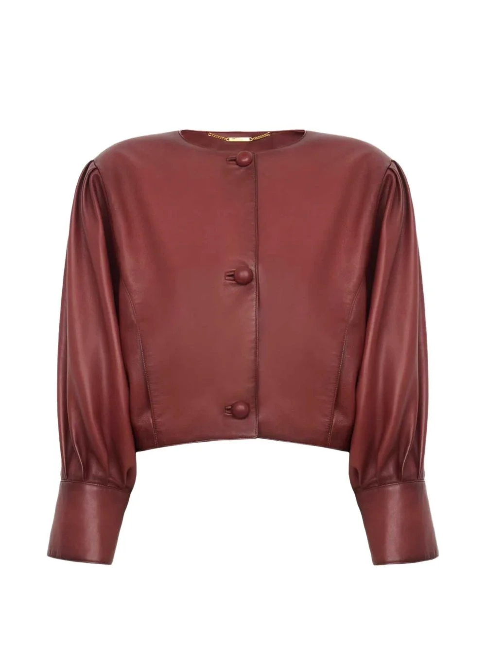 puff-sleeve leather jacket Highlights - Burnt red - Puff sleeves - Button fastening - Round neck - Leather Imported Composition Lining: Calf Leather 100% Washing instructions Read Manufacturer Guidelines